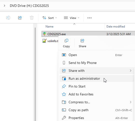 3. Right-click CDGS2025.exe. Click Run as Administrator