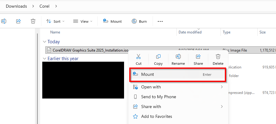 2. Windows Explorer will open. Right-click the .ISO file to mount the CorelDraw GS 2025 image file.