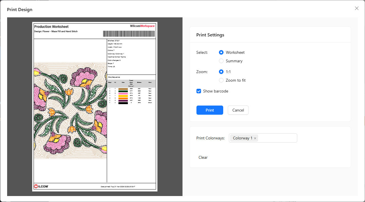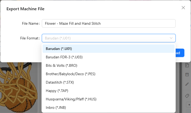 You can export designs in the Library to supported machine formats for embroidery production. To create production-ready files: