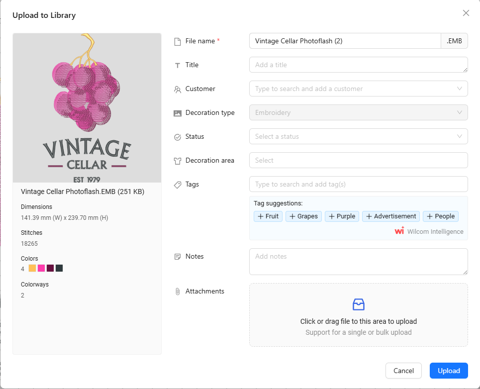 Each uploaded file becomes a structured design record, enriched with metadata such as: