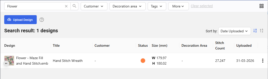 Filters allow you to narrow the list of designs displayed in the Library by selecting specific metadata values. By applying filters such as customer, status, decoration area, or tags, you can quickly focus on the designs that match your criteria and ...