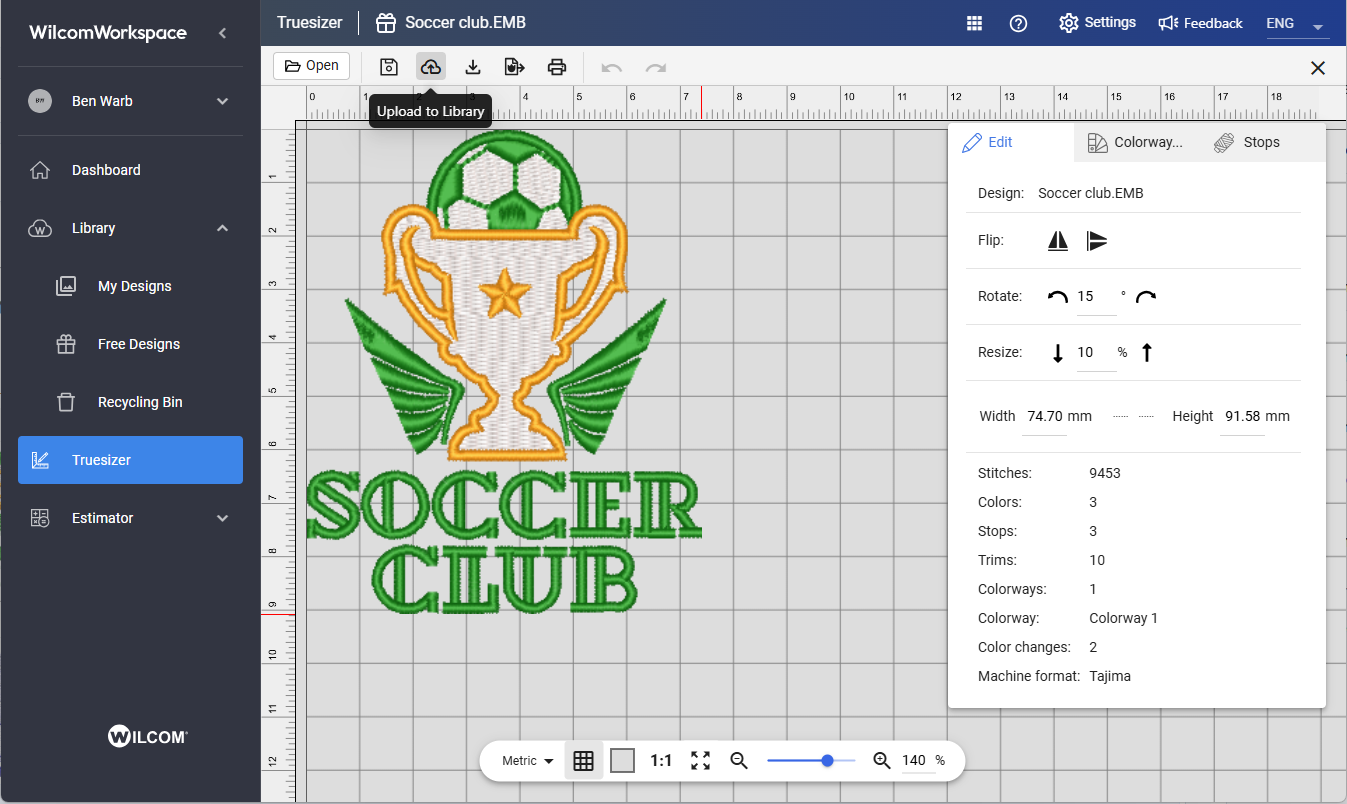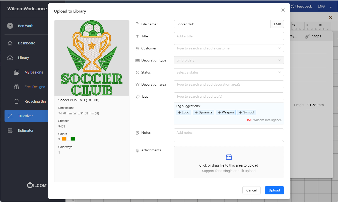 Designs can be uploaded to Wilcom Library directly from Truesizer, allowing you to save edited or newly created designs to your organization’s Library without leaving the editing environment. Uploading from Truesizer creates a design record in Library that stores the design file together with its metadata and technical properties. This makes it easy to move designs from editing into the shared Library so they can be organized, searched, and reused by your team.